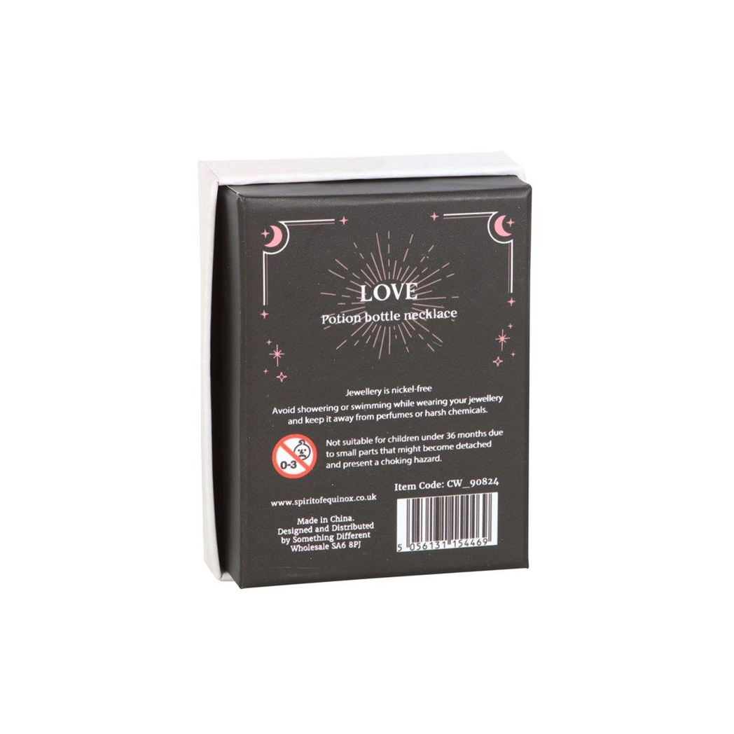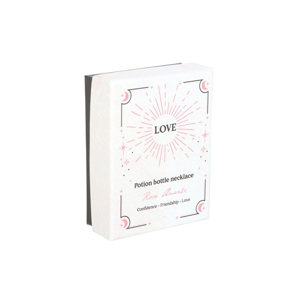 Give the gift of crystal magic with this miniature potion bottle necklace. With natural rose quartz crystal chips and a cork stopper, this necklace serves as a spellbinding accessory while attracting love, friendship and confidence. Presented in a matching gift box and perfect for that special witch in your life. Plastic bottle on a nickel-free stainless steel chain.