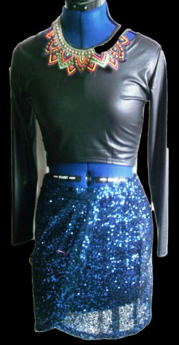 PUNK/BOHO/VINTAGEmidnight blue SEQUINNED CROSSOVER pencil skirt.size10.MISGUIDED