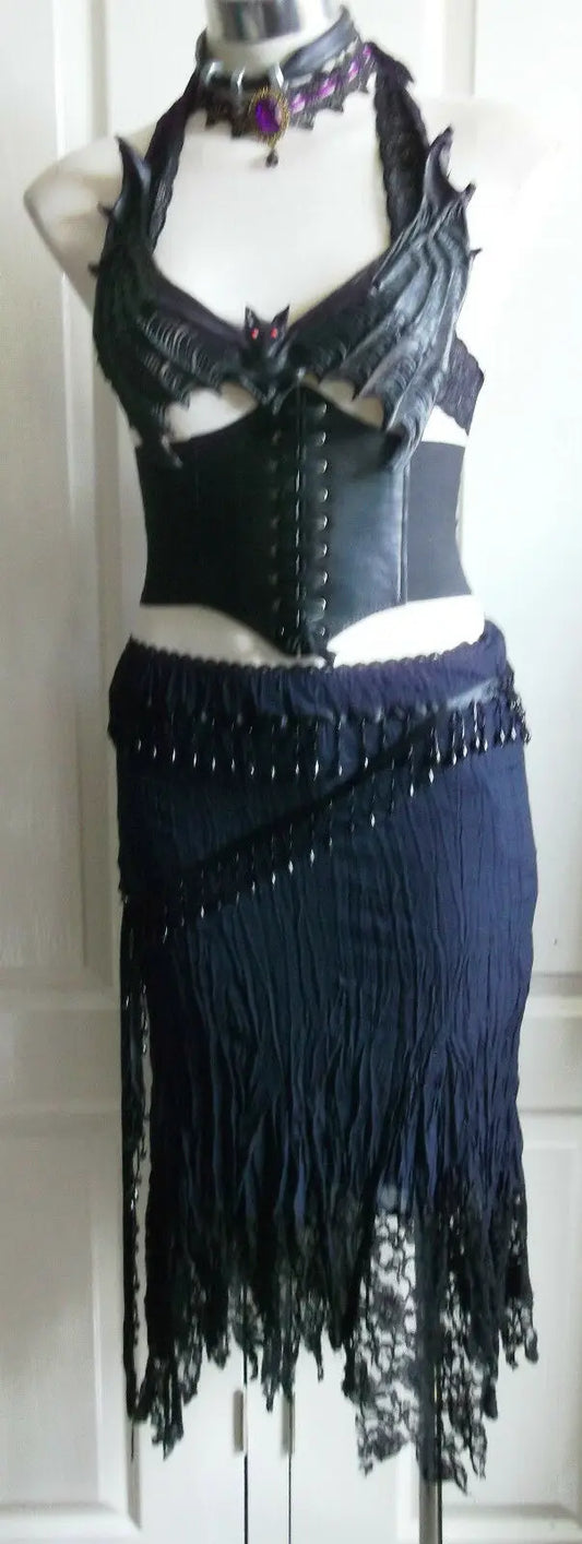 Gothic Black green Lace Angle Skirt Size 8-10 Festival-knee length/diag cut