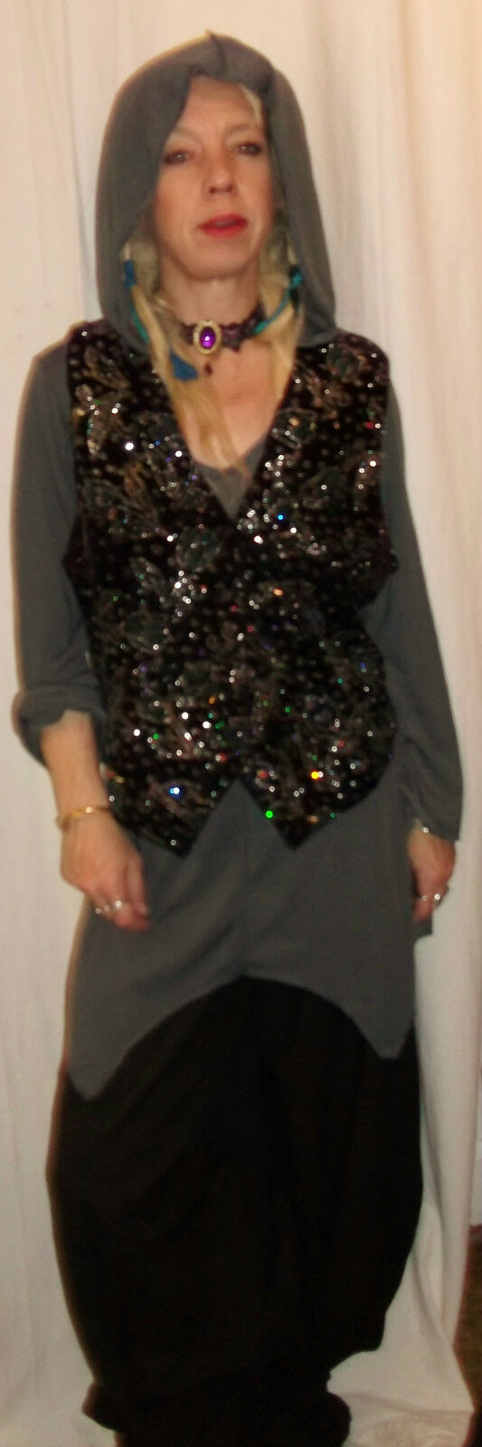 FIGURE HUGGING, VERY COMFY,FUNKY AND COOL.WITH LARGE DRAPING PIXIE/POINTED HOOD AND LONG POINTED/GOTHIC SLEEVES (OVER WRIST) VARIOUS COLOURS & SIZES AVAILABLE-:SMALL/MEDIUM/LARGE SIZES AVAILABLE-:SMALL/MEDIUM/LARGE