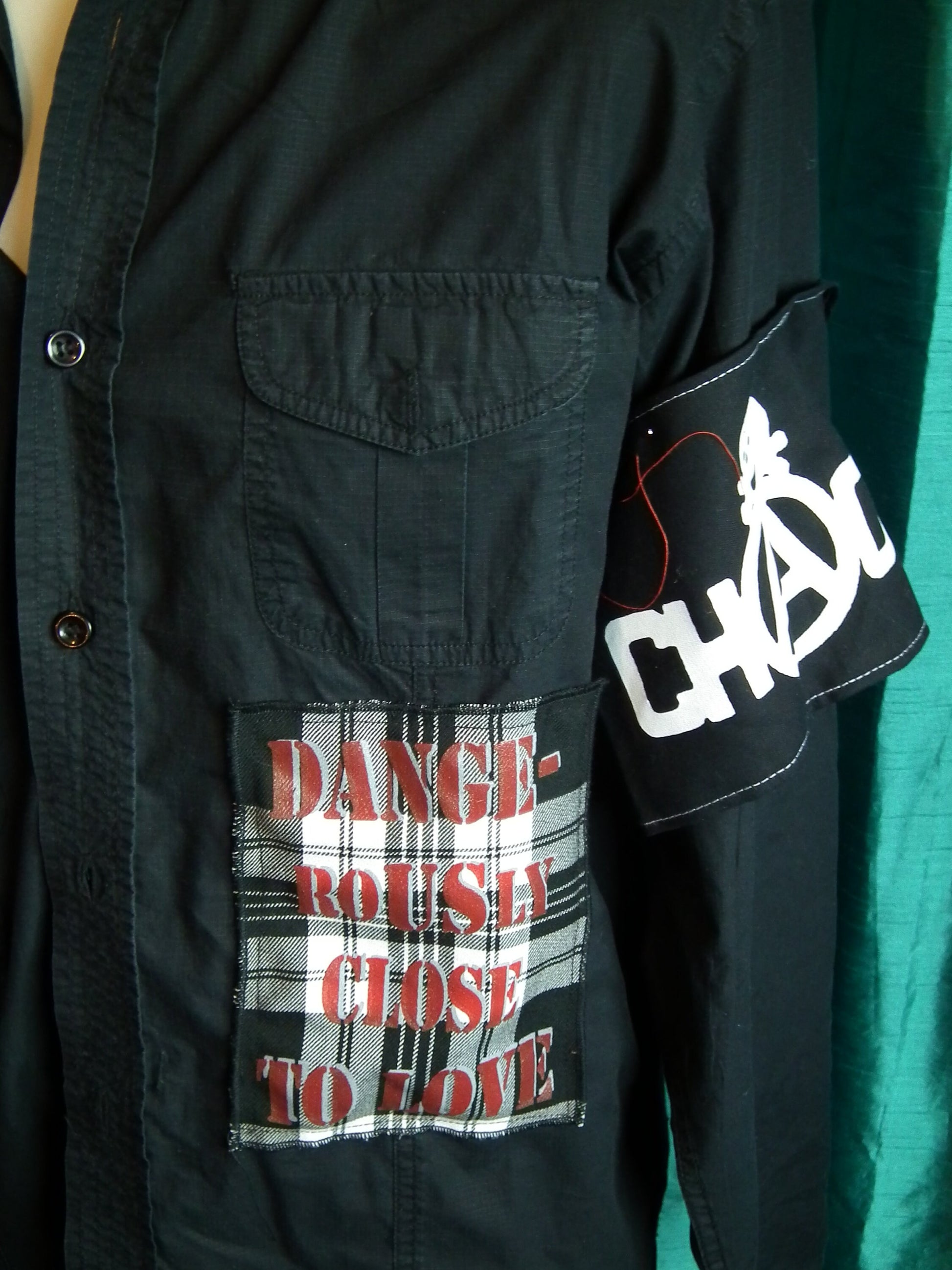 black PUNK bespoke, long sleeve shirt, size |X|L with patches.ch 48"/sh 18