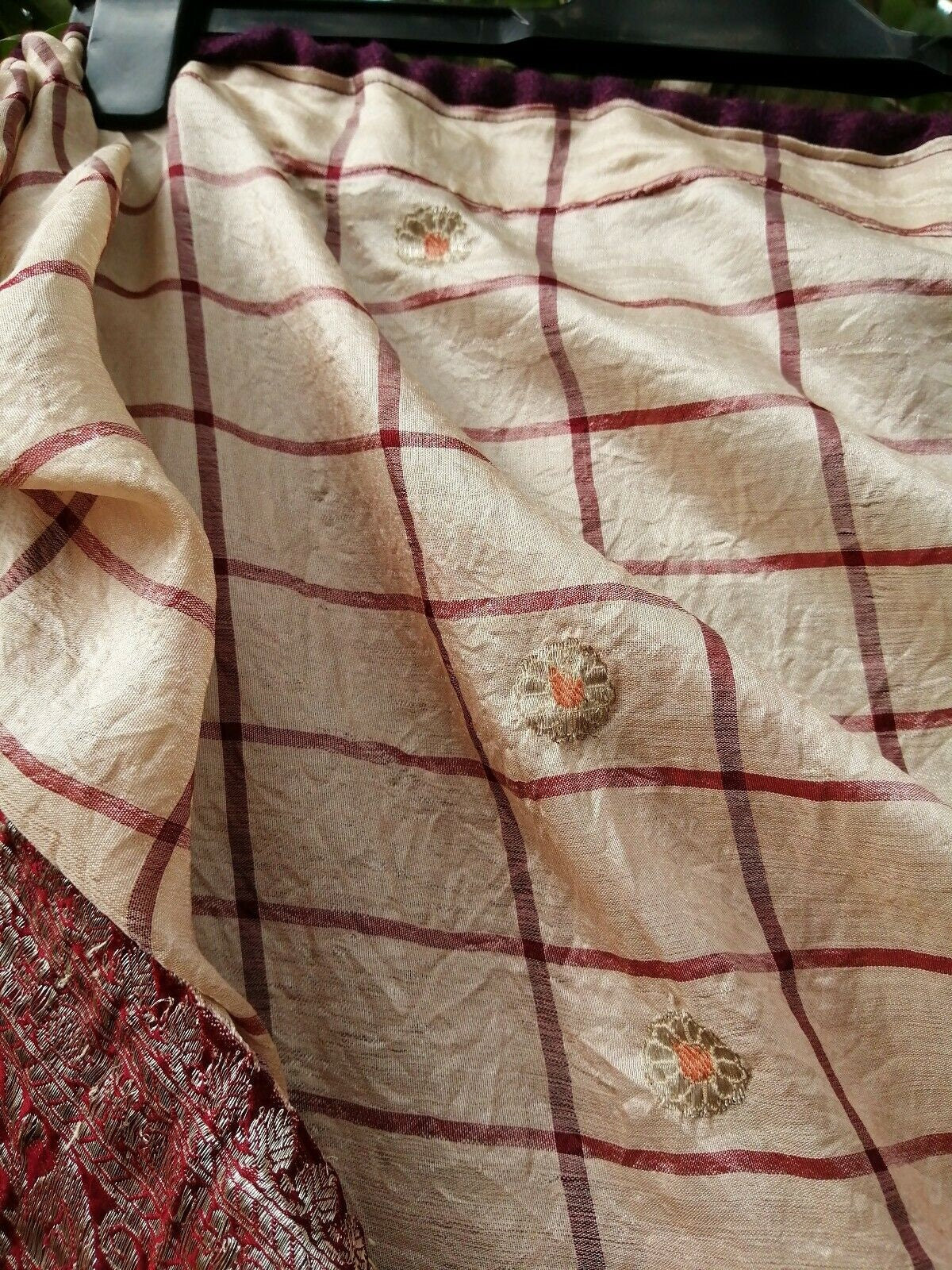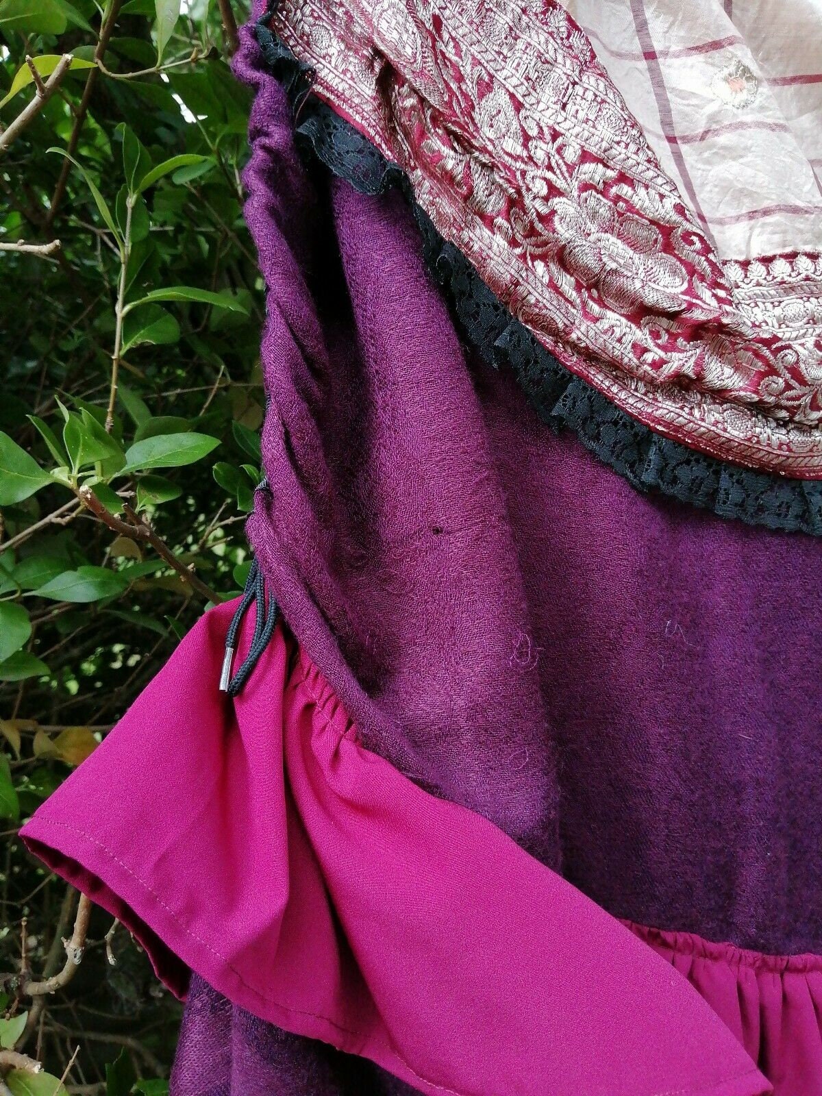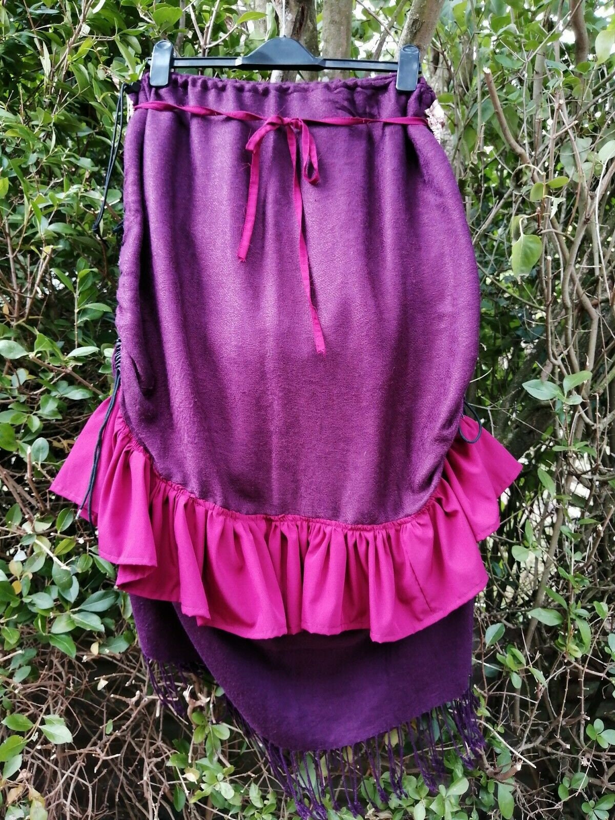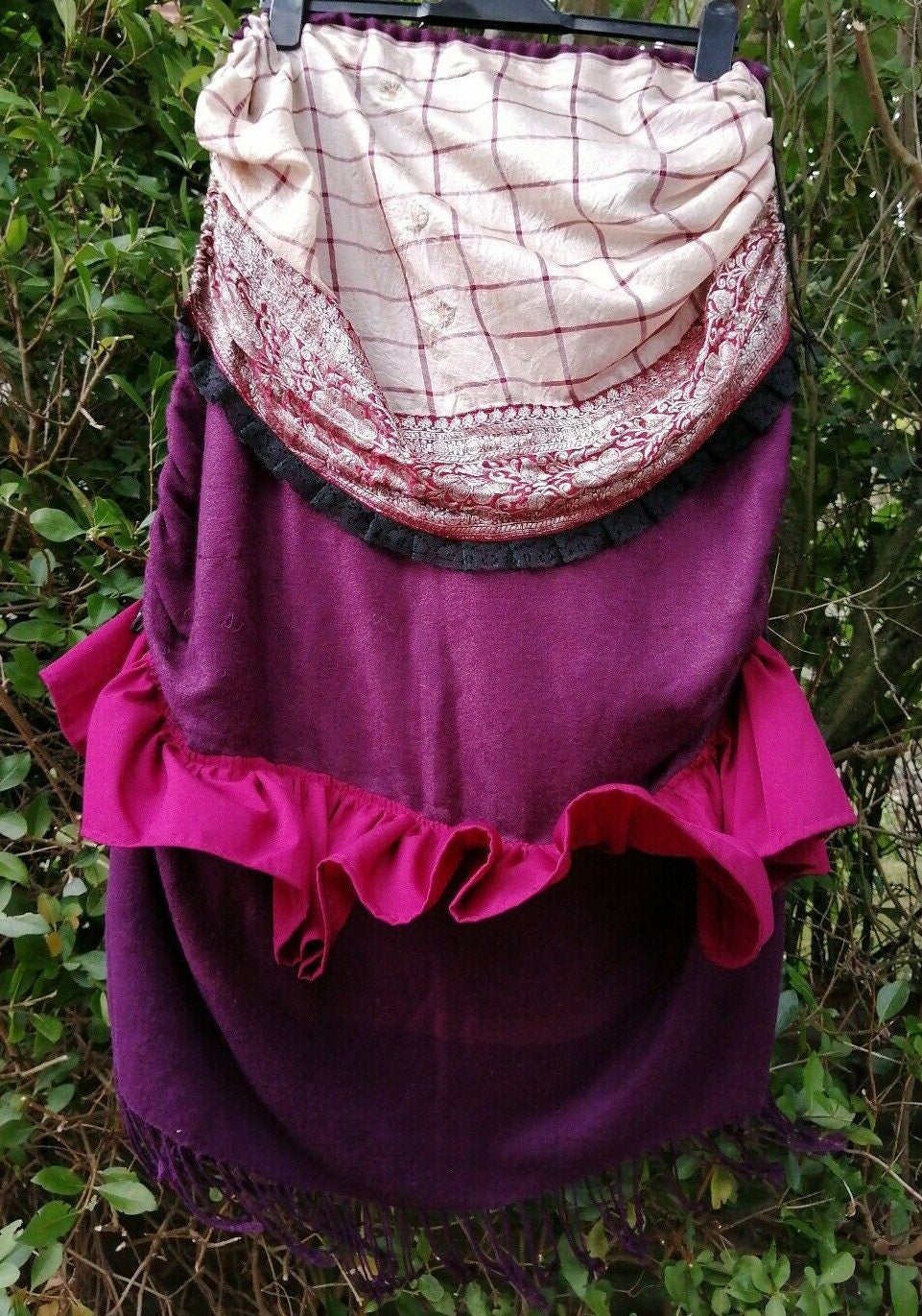 Burgundy Layered, Ruffled, Hitched Skirt Steampunk OOAK. Layered skirt with detailed embroidered silk panel to front, fringed hem, fabric ruffle to middle of skirt, ruching bands to side can be adjusted to increase or decrease hitching to sides. Waist is elasticated and adjustable.