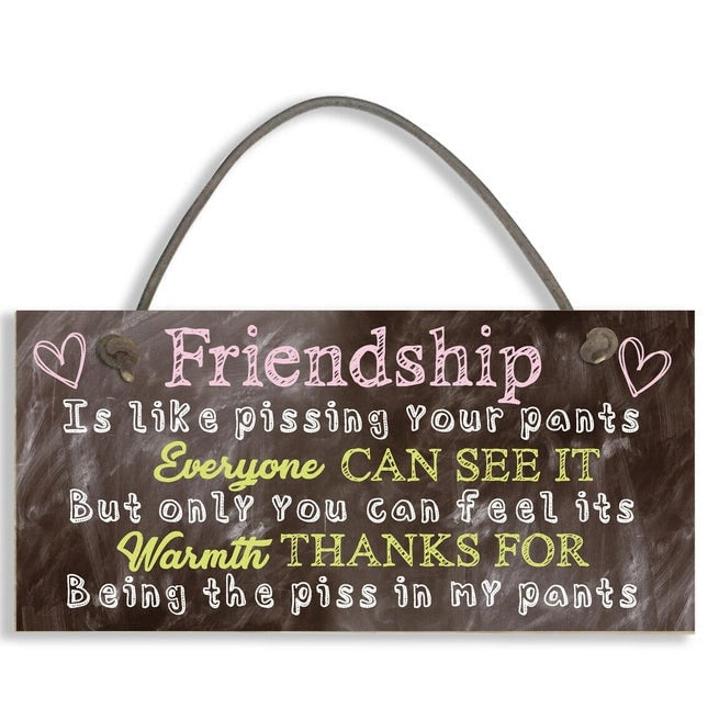 "Friendship is like pissing your pants.Everyone can see it but only you can feel its warmth. Thanks for being the piss in my pants" 5mm thick with real leather strap The perfect gift for friends & loved ones. Suitable for indoor or outdoor use Features: laque Size: 90 x 190 mm (approx) Style: Rustic / Shabby Chic Material: High Grade PVC Hanger Material: Leather The plaque is made from high grade PVC, 5mm thick and will last for years and years. The design is printed onto the plaque using a high quality state of the art printer. The plaque is supplied with real leather strap to allow easy hanging and looks great in any room of the house.