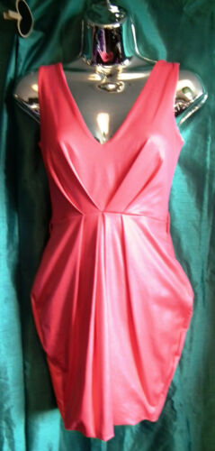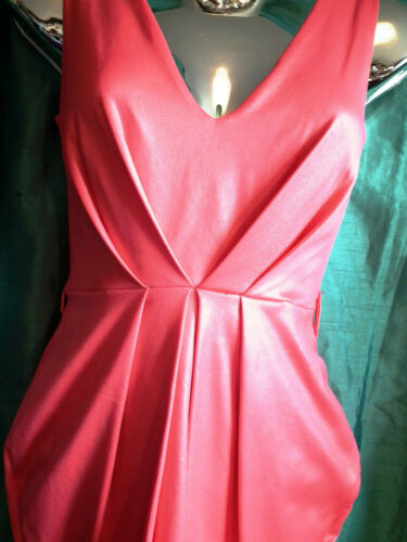 kneelength, puffball drapey style dress, in luzurious stretchy coral pink, very unusual fabric, sorta luminously metallic,shiny??..., very flattering drapey pencil skirt, sleeveless.