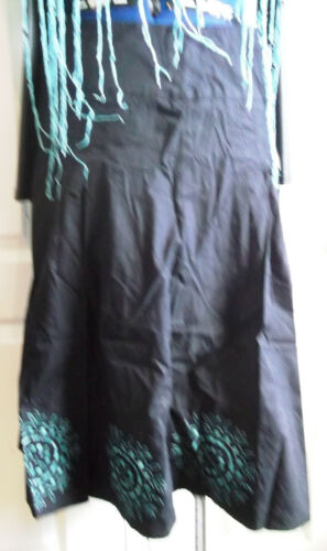 PUNK/goth/BOHO/vintage BLACK cotton long floaty SKIRT,green embroidered paisley sections on skirt. drop wist, hidden zip fasteneing