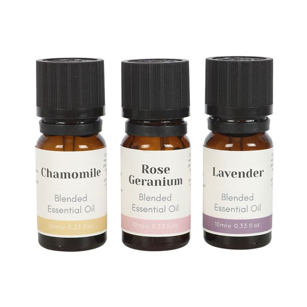 Create the perfect aromatic atmosphere or bathtime soak with this Set of 3 Floral Blended Essential Oils. Crafted with a natural blend of Rose Geranium, Lavender, and Chamomile, these essential oils are designed to help you relax and unwind after a long day. Set includes three 10ml bottles. Vegan and bottled in the UK.