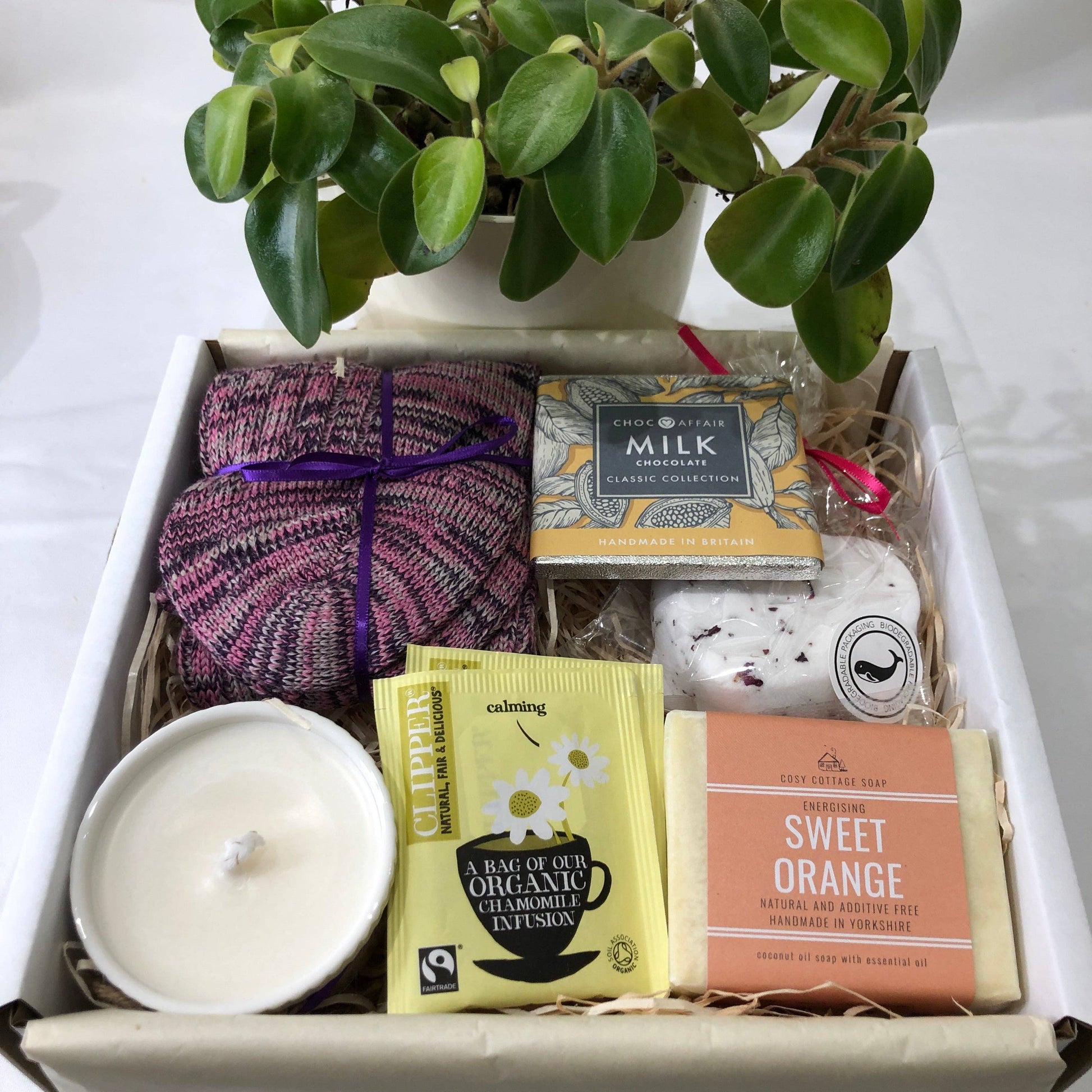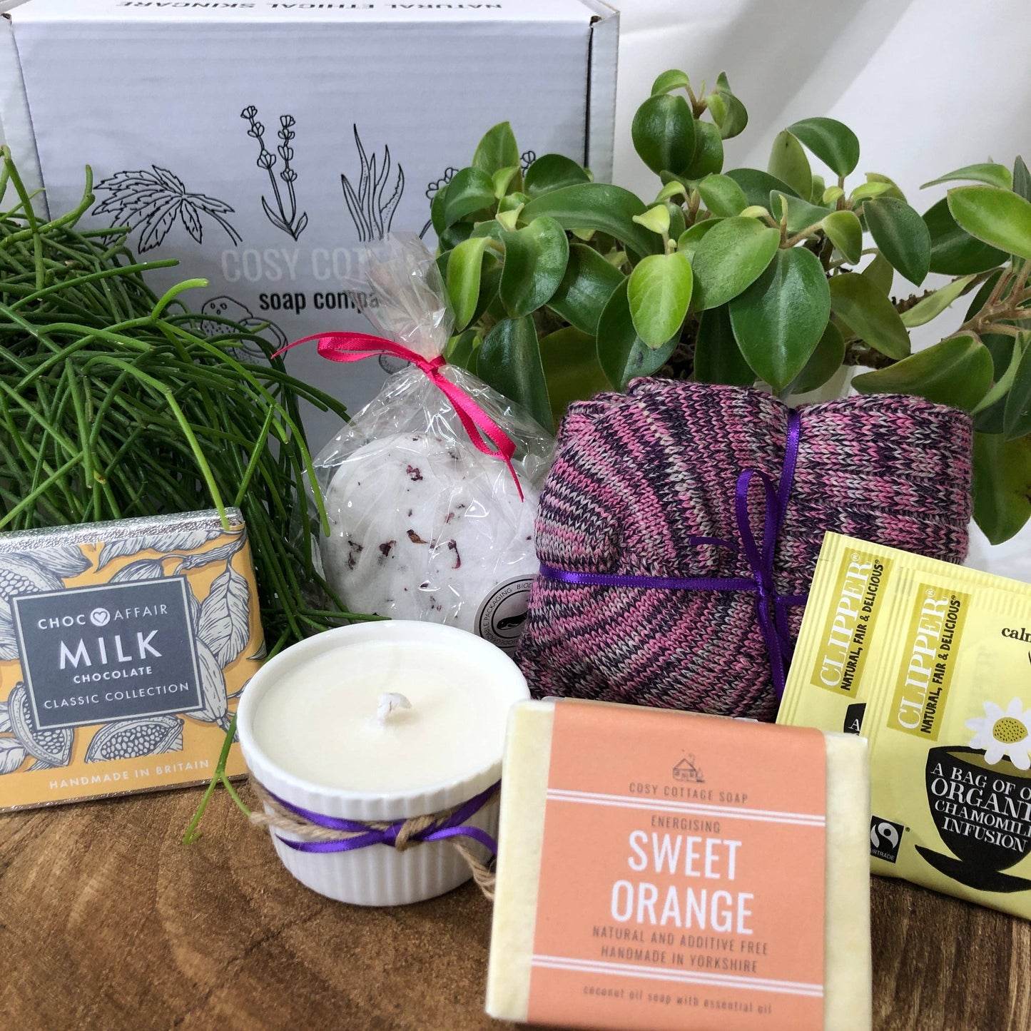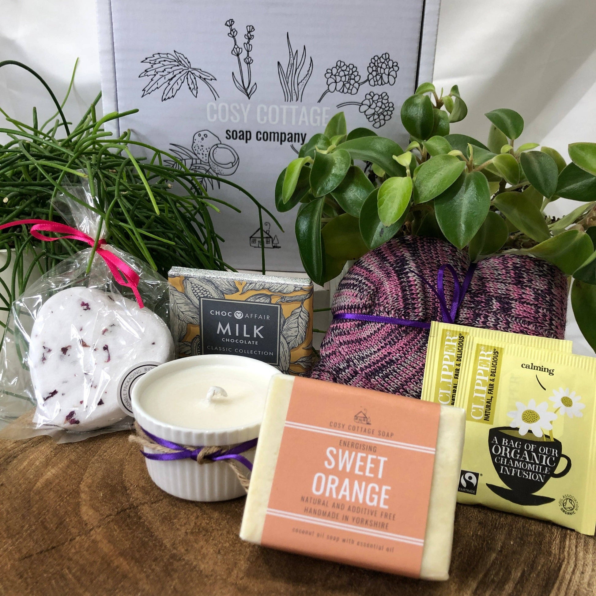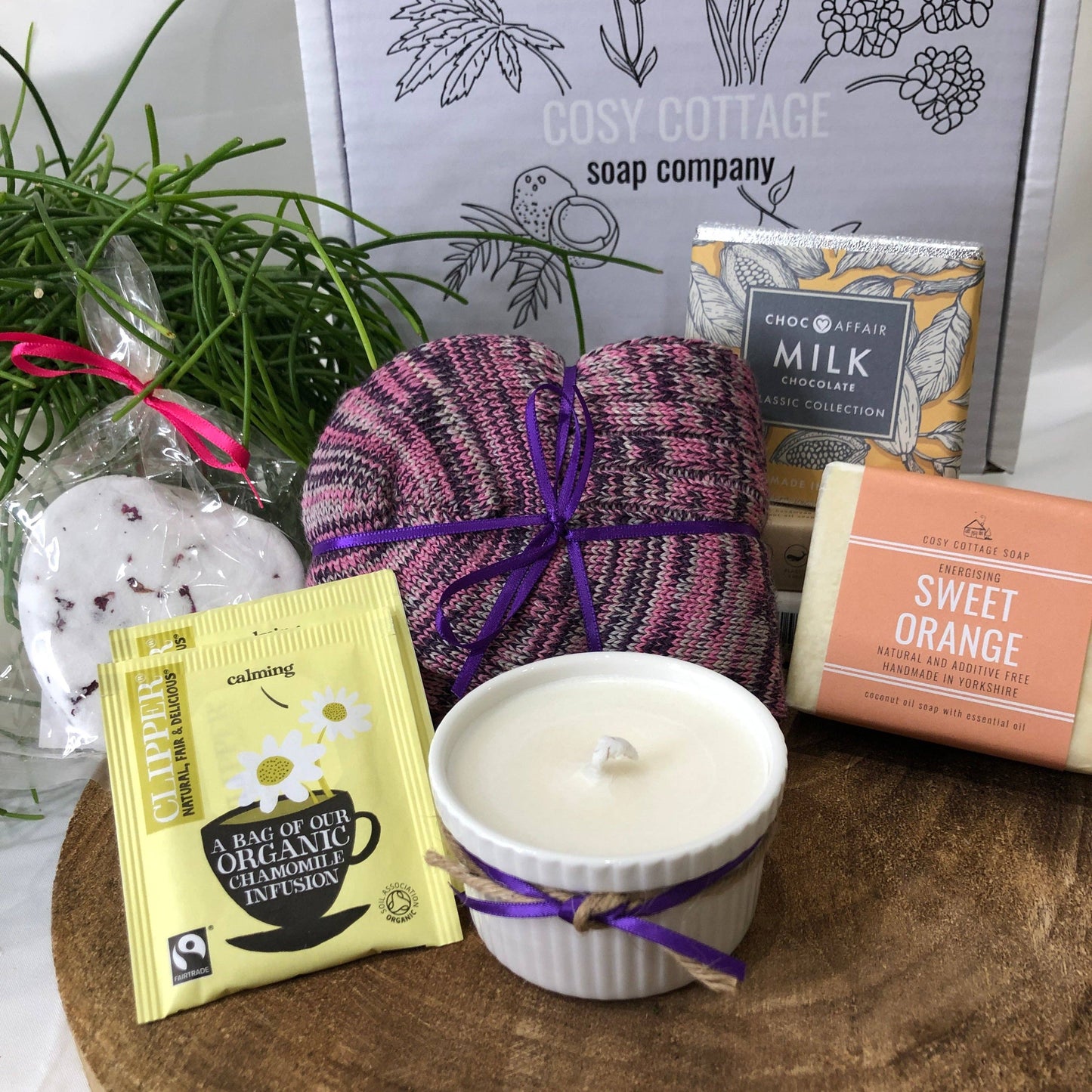 Everything you need to get super comfortable, snuggly and cosy. this is one of our most popular boxes and would make an ideal gift or a tempting treat. 110g Large Sweet Orange Soap: Sodium cocoate, sodium olivate, sodium beeswaxate, sweet orange essential oil (limonene, citral) 1 x Lavender Soy Wax Candle (soy wax, lavendula angustifolia essential oil) 1 x Pair of Yorkshire Made Woollen Socks in ladies' sizes 5 to 7) 60g Heart Shaped Geranium Bath Bomb: Citric acid, sodium bicarbonate, geranium essential oil (geraniol, citral, citronellol, linalool), dried geranium petals 2 x Chamomile Tea Bags 1 x 30g Milk Chocolate Bar from ChocAffair