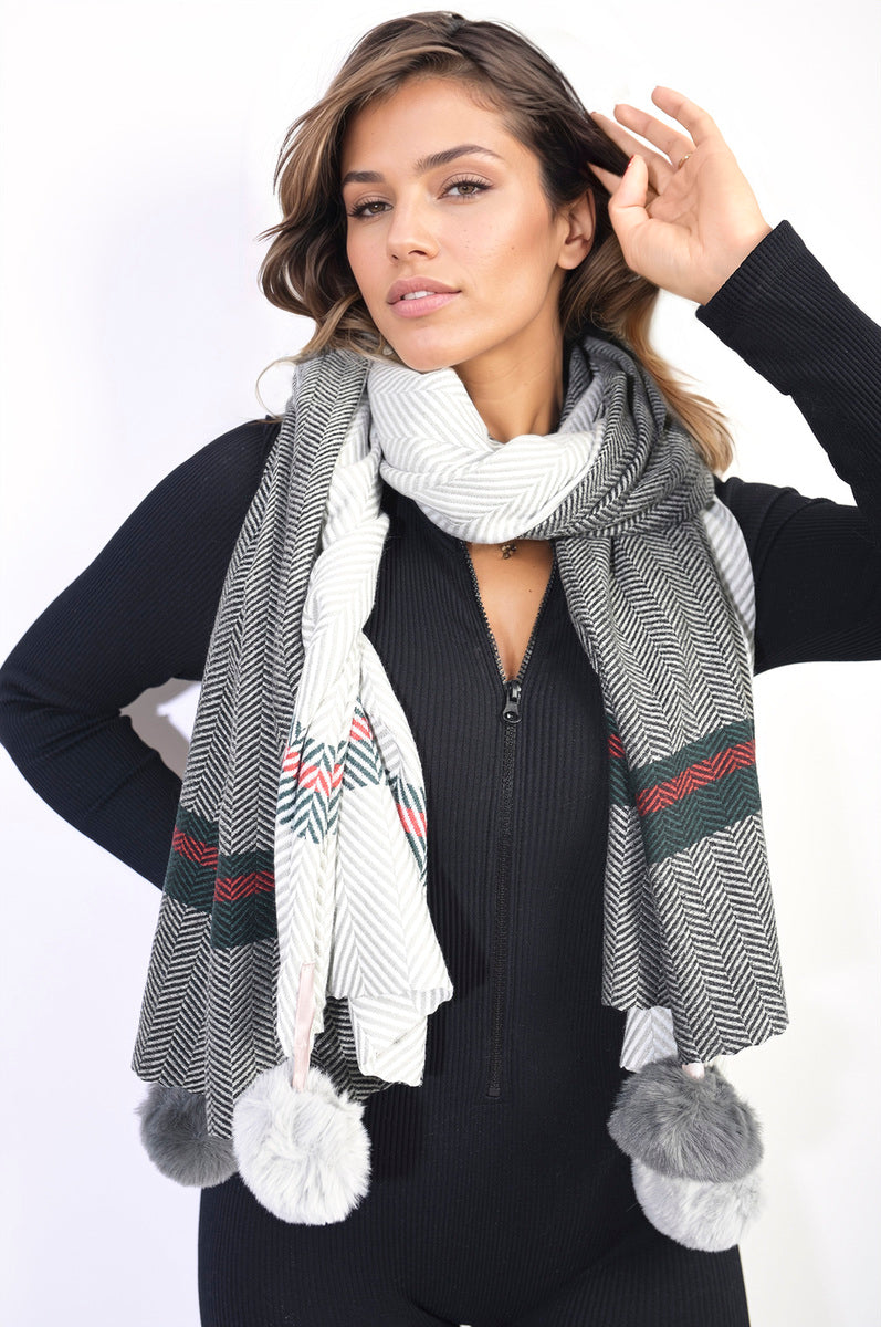 Striped Pompom Tassel Winter Scarf